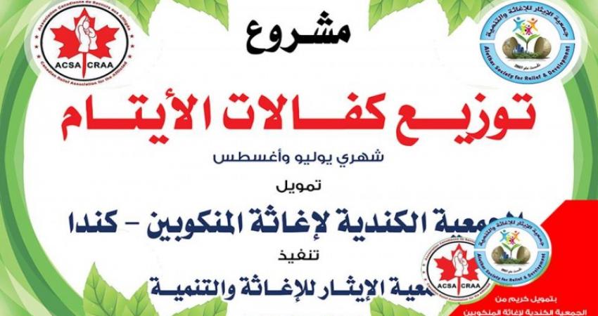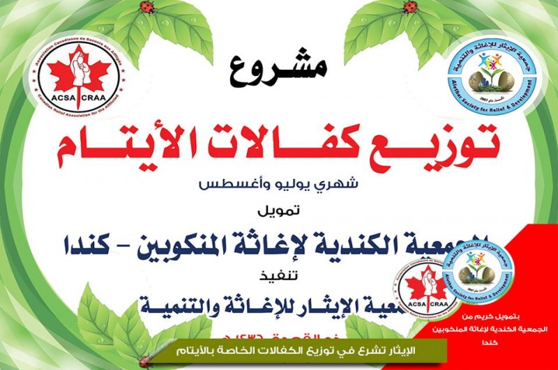 وزعت جمعية الإيثار للإغاثة والتنمية شرق محافظة خانيونس، اليوم الثلاثاء، كفالات الأيتام المكفولين لديها وذلك عن شهري يوليو وأغسطس 2015، بالتعاون مع الجمعية الكندية لإغاثة المنكوبين كندا واهل الخير في المملكة العربية السعودية، وبلغ عدد الأيتام المستفيدين من هذه الكفالات 80 يتيماَ.
