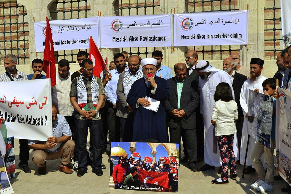 وقد شارك في الوقفة التضامنية عدة مؤسسات منها هيئة علماء فلسطين في الخارج وهيئة علماء أهل السنة في تركيا والاتحاد العالمي لعلماء المسلمين، وجمع من ابناء فلسطين والعرب والأتراك، وقد طالب المجتمعون بنصرة الأقصى ووقف الهجمة الاسرائيلية الشرسة ضد الأقصى والمقدسيين، معتبرين هذه الخطوة تمهيدا لتقسيم الأقصى، محذرين في ذات الوقت من خطورة التصعيد الاسرائيلي المستمر في القدس.