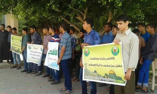 نظمت الكتلة الإسلامية في كلية الدعوة الإسلامية في مدينة دير البلح وسط القطاع وقفة طلابية نصرة للمسجد الأقصى المبارك داخل أسوار الكلية، حيث شارك فيها العشرات من طلاب وطالبات الكلية.