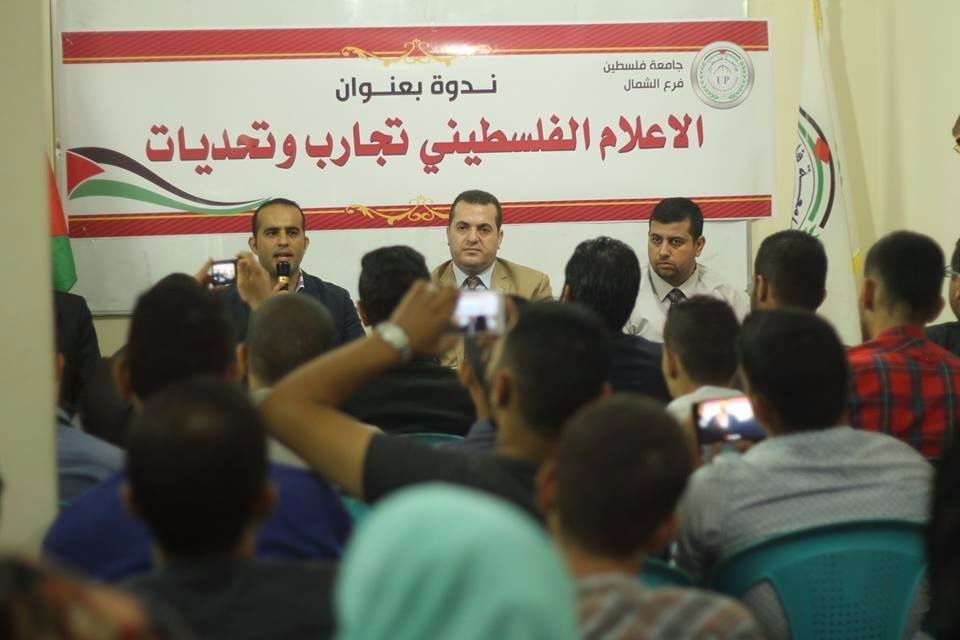 ضمن أنشطتها اللامنهجية واهتماماتها في الارتقاء بمستوى الطلبة والحرص على تنمية قدراتهم وإمكاناتهم ، نظمت جامعة فلسطين فرع الشمال ندوة بعنوان "الإعلام الفلسطيني تجارب وتحديات"، بحضور الدكتور نادر أبو شرخ مدير فرع الجامعة في محافظة الشمال والأستاذ الإعلامي تامر المسحال ضيف اللقاء وأعضاء الهيئة التدريسية وطلبة كلية الإعلام والعلاقات العامة والتسويق بالإضافة للطلبة المهتمين.