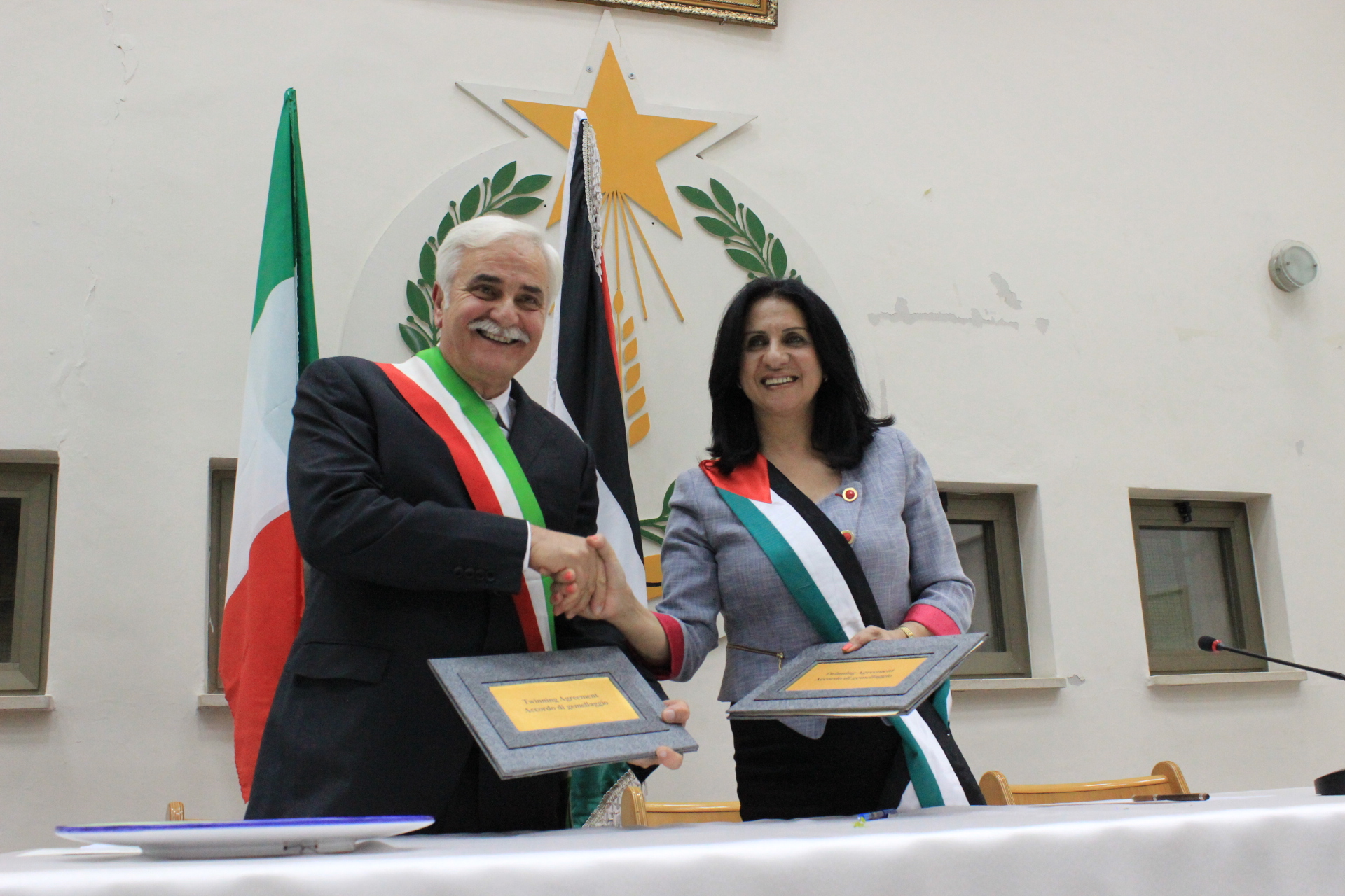 وجاءت الزيارة والتكريم بحضور رئيسة مجلس النساء العالميات من أجل السلام نامهي كيم ورئيس المجلس الشبابي في بيت لحم إيليا نصار، ونائب رئيس المجلس الشبابي كارلوس سمور.