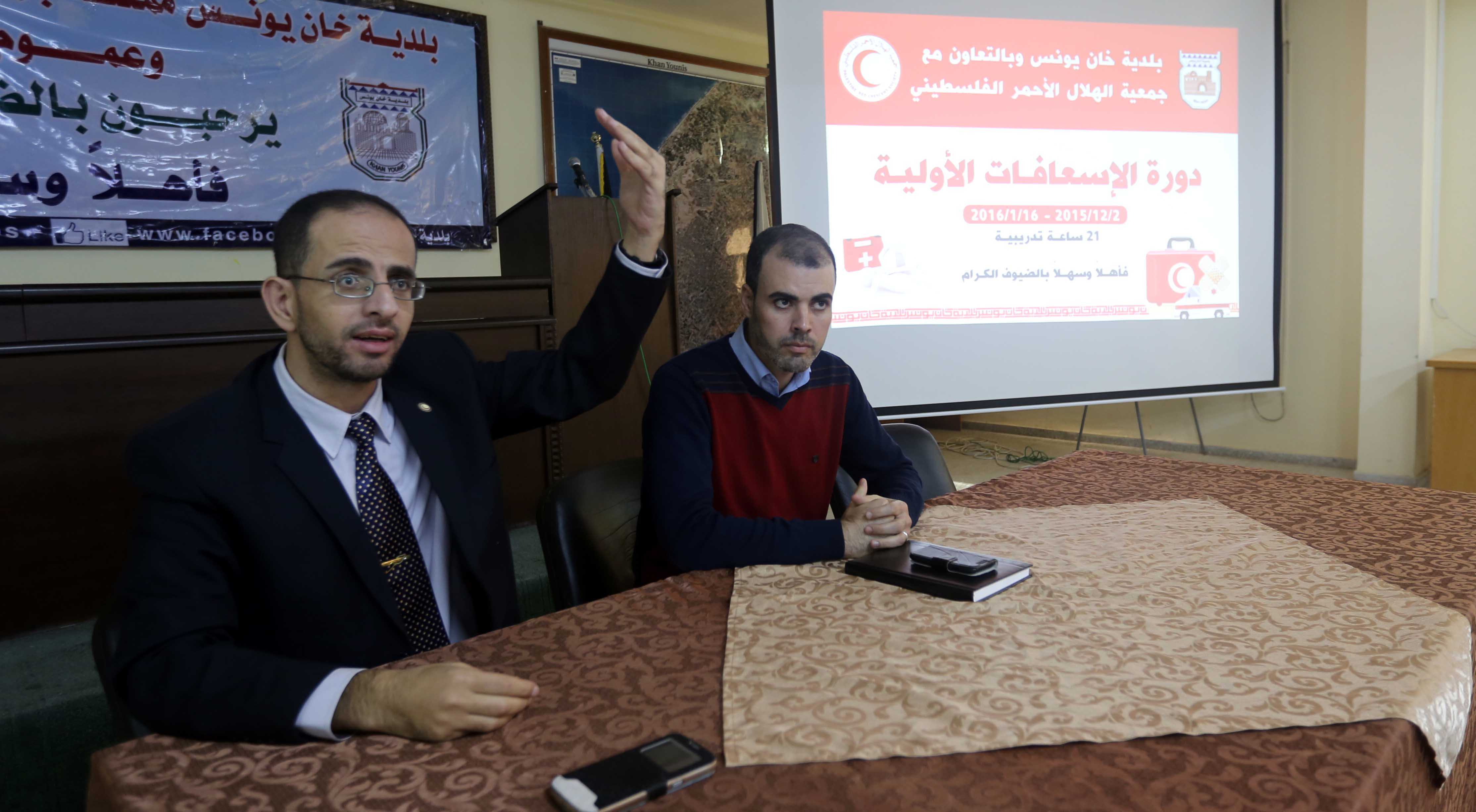 بالتعاون مع جمعية الهلال الأحمر الفلسطيني "الإسعاف والطوارئ" نظمت بلدية خان يونس دورة الإسعافات الأولية بمشاركة (25) موظفاً من العاملين بالبلدية وذلك بهدف تنمية التثقيف الصحي لديهم، وتستمر الدورة لـ(7) أسابيع متواصلة بواقع (21) ساعة تدريبية.