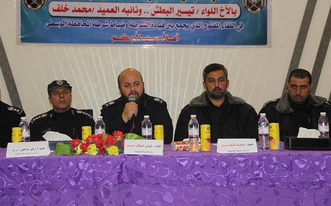 قيادة شرطة المحافظة الوسطى تنظم لقاءً مفتوحاً جمع مدير الشرطة الفلسطينية اللواء تيسير البطش ونائبه العميد محمد خلف ومدراء إدارات الشرطة مع شرطة المحافظة الوسطى وعلى رأسهم مدير شرطة المحافظة العقيد فؤاد أبو بطيحان وجميع المدراء والضباط.