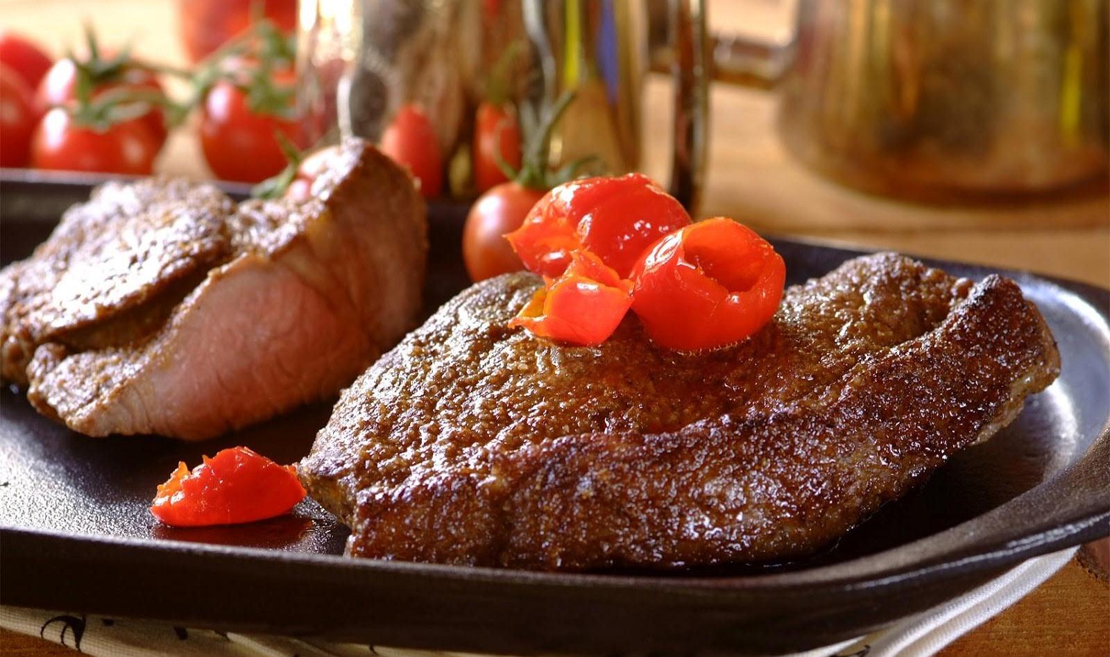 6- تُغطى شرائح الستيك المشوى فى ورق الفويل وتترك لمدة 10 دقائق، ثم تُرص فى صحن التقديم وتزين بشرائح الطماطم، وتقدم مع الخضراوات والسلطات.