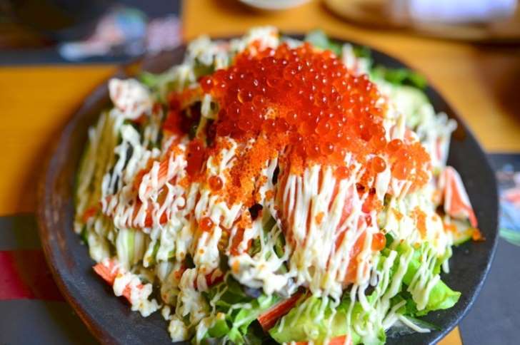 مقبلات: سمك السلمون المدخن والكافيارالروبيان والسلمون بعصير الرمان.