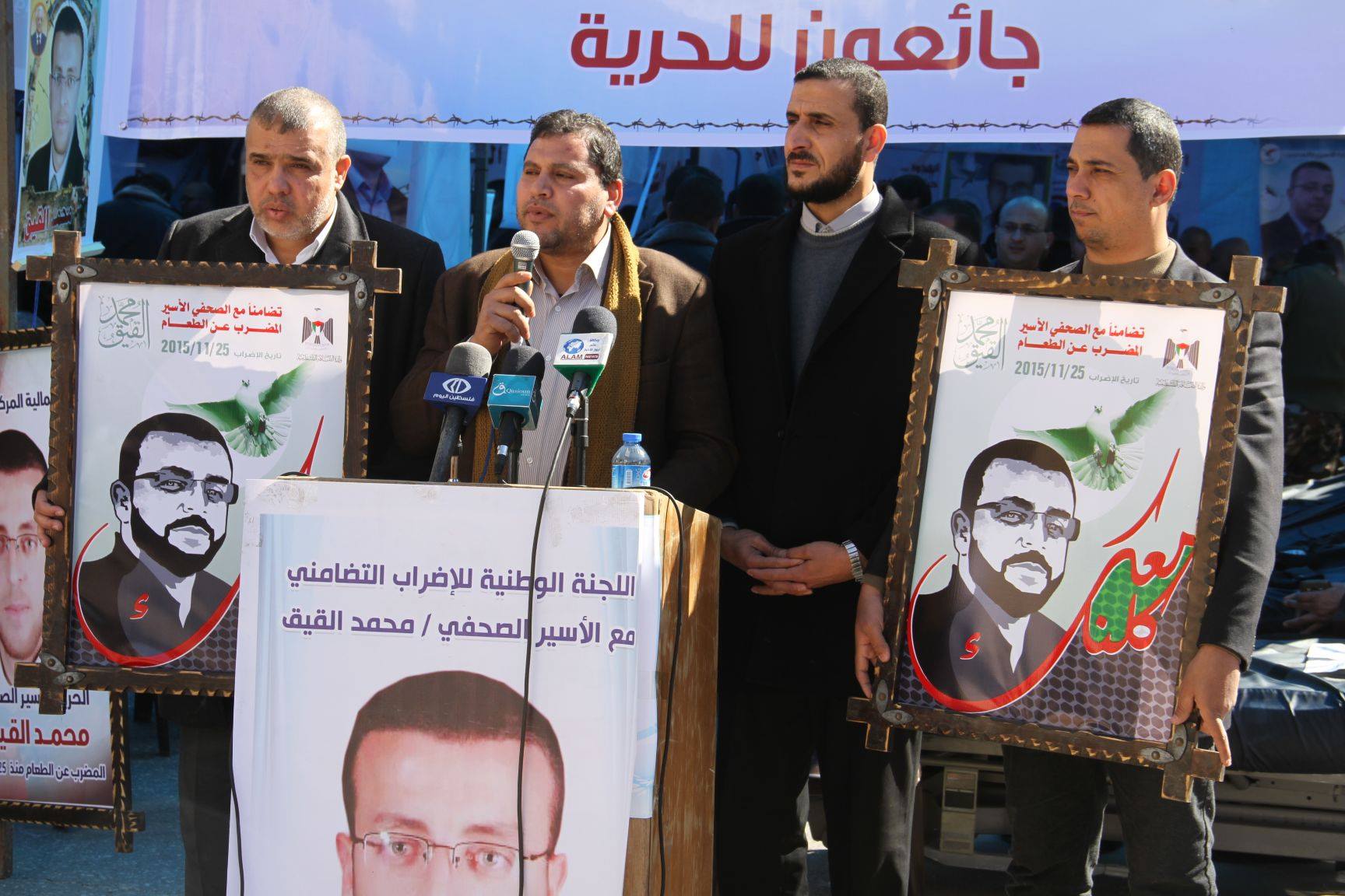 وفي كلمة وزارة الثقافة تحدث مدير عام الإبداع والفنون عاطف عسقول وقال: إن الصحفي القيق يمارس حقه الذي شرعته جميع القوانين الدولية بالإضراب عن الطعام ويتحدى الظلم والقهر والسجان بأمعائه الحاوية احتجاجا على اعتقاله الإداري الذي لن يثني شعبنا عن المضي نحو الحرية.