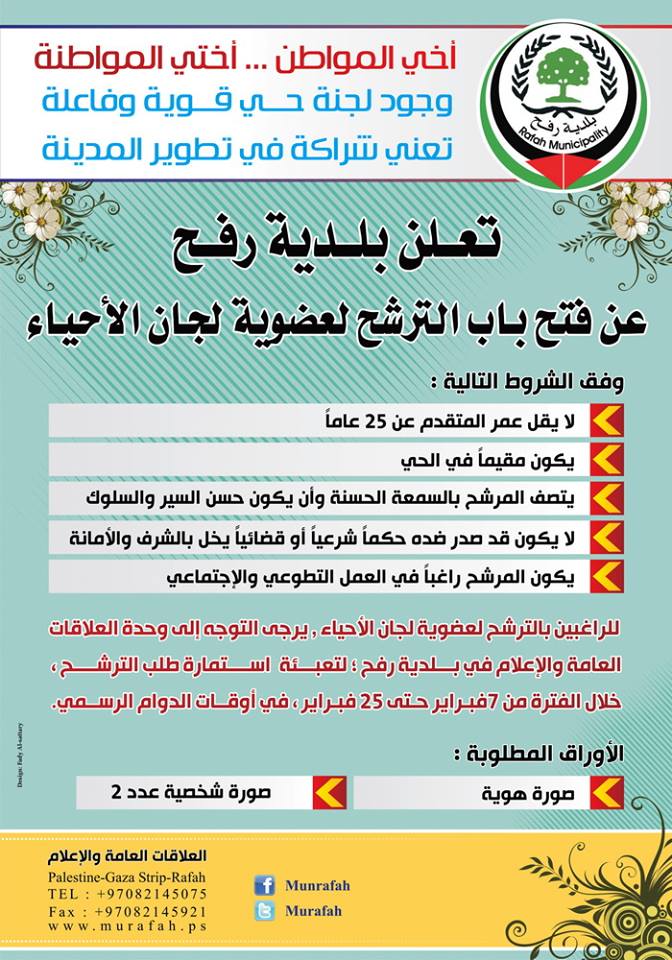 أعلنت بلدية رفح عن فتح باب الترشح والانتساب لعضوية لجان الأحياء في كافة أحياء محافظة رفح , ابتداء من السابع من فبراير الجاري وحتى الخامس والعشرين من ذات الشهر.