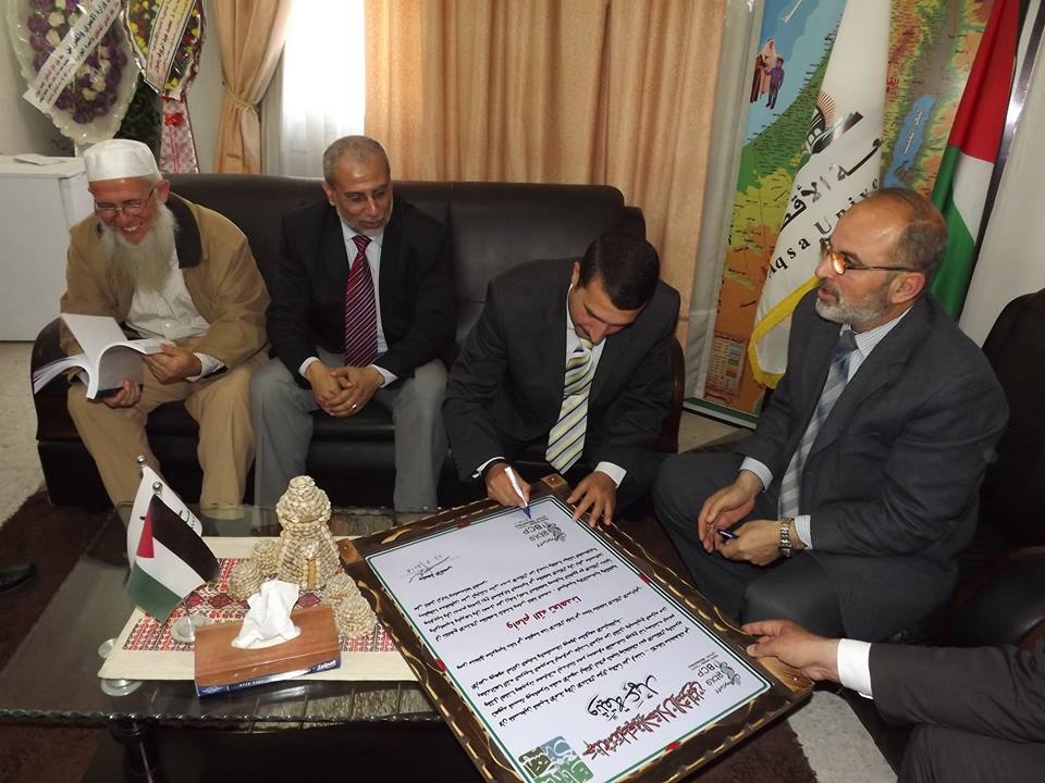 وتم توقيع الوثيقة بين رئيس حملة المقاطعة سائد عايش، والقائم بأعمال رئيس جامعة الأقصى محمد رضوان.