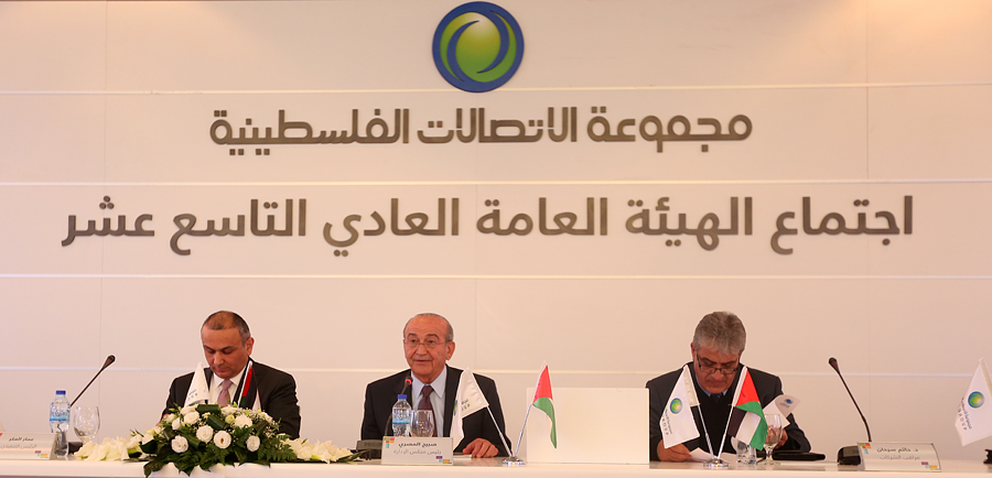 وعقدت "عمومية الاتصالات" اجتماعها العادي التاسع عشر في كل من رام الله وغزة، بحضور وزير الاتصالات وتكنولوجيا المعلومات علّام موسى، ورئيس مجلس الإدارة صبيح المصري، وأعضاء مجلس الإدارة، ومراقب الشركات في وزارة الاقتصاد الوطني حاتم سرحان، ومدير عام هيئة سوق رأس المال براق النابلسي، والرئيس التنفيذي لبورصة فلسطين أحمد عويضة، وبمشاركة مساهمين يحملون 74% من أسهم الشركة البالغة حوالي 131 مليون دينار.