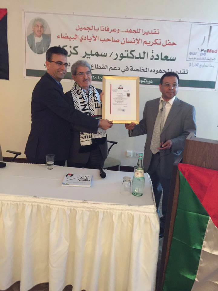 احتضنت مدينة دورتموند الألمانية، حفل التكريم الذي أقامه تجمع الأطباء الفلسطينيين في أوروبا تكريما ًوعرفانا ً؛ للخدمات الطبية والمساهمات الإنسانية التي قدمها الطبيب السوري واستشاري جراحة المخ والأعصاب في مستشفى مدينة " لونين " غرب ألمانيا الدكتور " سمير كزكز " على مدار سنوات، أجرى خلالها مئات العمليات الجراحية المجانية في مستشفيات القدس والضفة الغربية وقطاع غزة، وعمل على خلالها على تدريب الكوادر الطبية في مجال جراحة المخ والأعصاب في تلك المستشفيات.