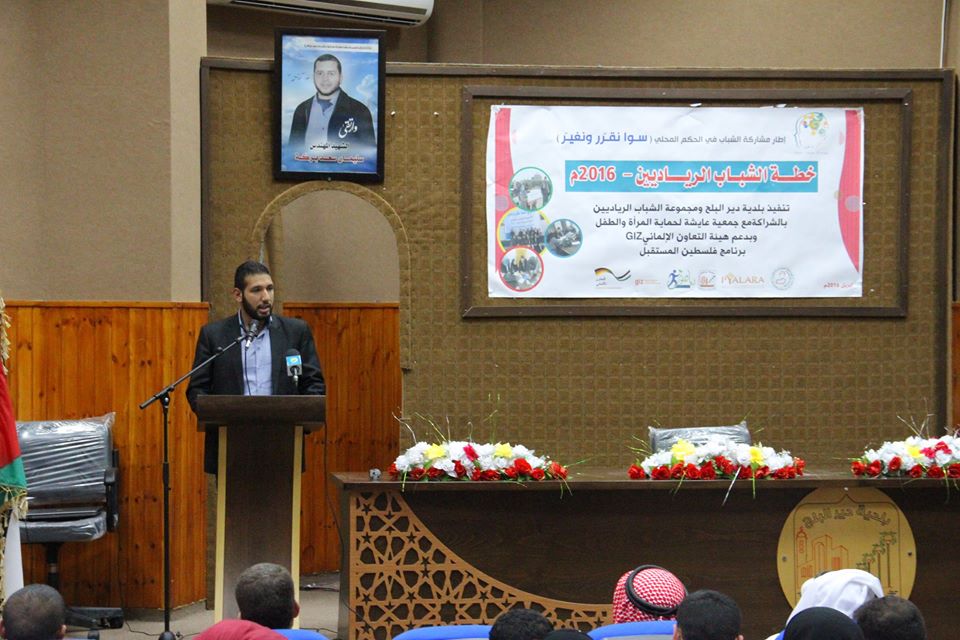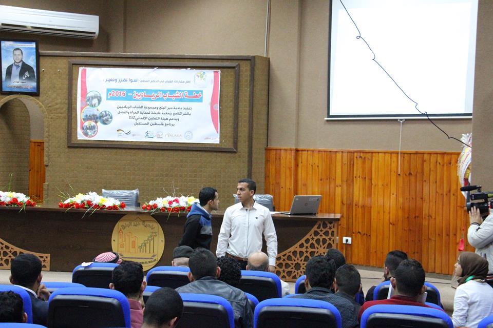 نظم الشباب الرياديون في بلدية مدينة دير البلح وسط القطاع، حفل "إطلاق خطة الشباب الرياديين لعام2016" عصر أمس، بالتعاون مع جمعية "عايشة" لحماية المرأة والطفل والهيئة الفلسطينية للإعلام وتفعيل دور الشباب.