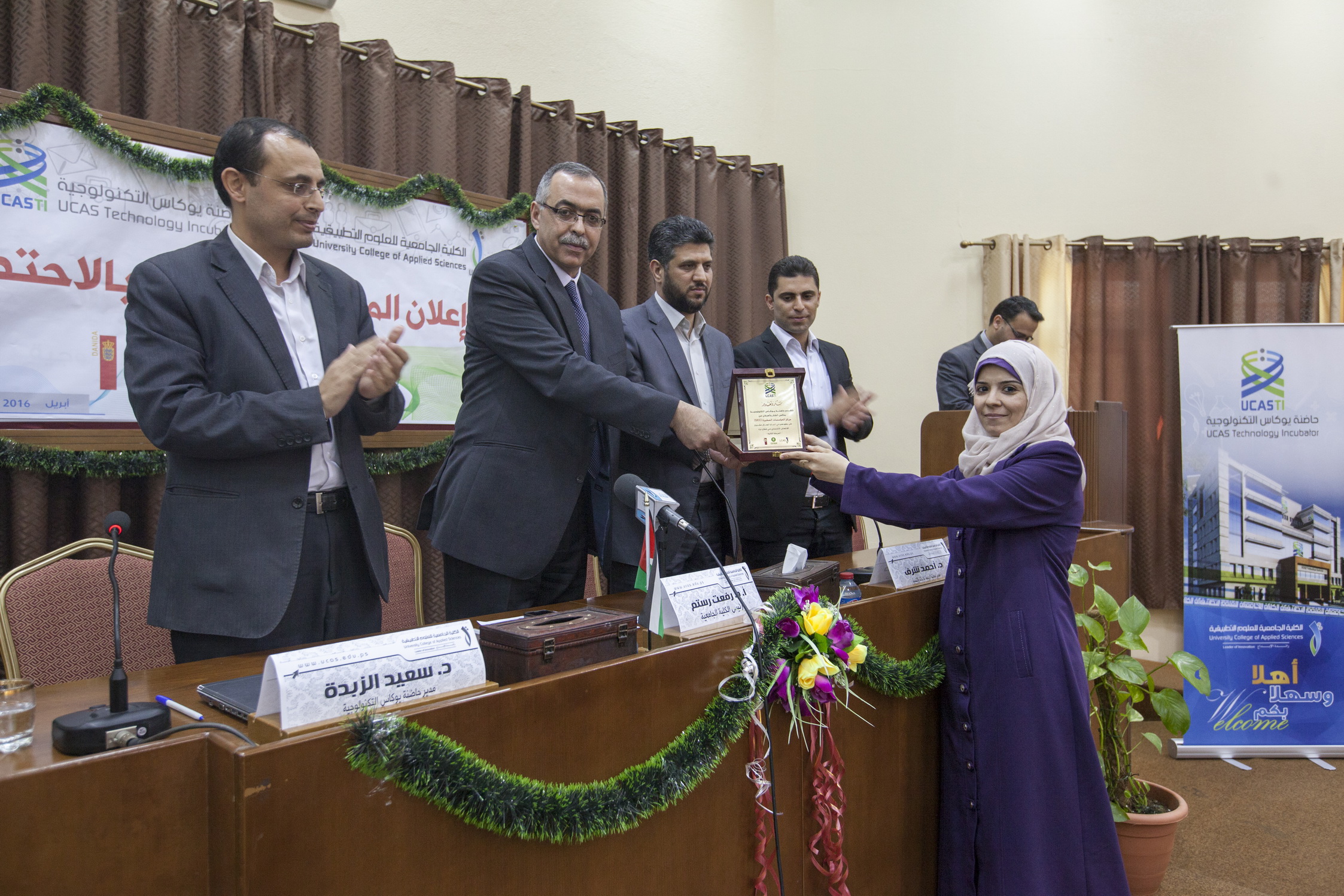 احتفلت الكلية الجامعية للعلوم التطبيقية بالإعلان عن المشاريع الفائزة بالاحتضان للعام 2016-2017 في حاضنة يوكاس التكنولوجية، وذلك بحضور ومشاركة كل من الاستاذ الدكتور رفعت رستم رئيس الكلية، الدكتور أحمد شرف مدير جمعية الرحمة للإغاثة والتنمية، السيد لؤي الحداد منسق مشروع الانتعاش الاقتصادي في الاوكسفام، الدكتور سعيد الزبدة مدير حاضنة يوكاس التكنولوجية، وممثلين عن المؤسسات الشريكة والصديقة والمانحة، والهيئة الاستشارية للمشاريع الفائزة واللجان المحكمة، وأصحاب المشاريع.