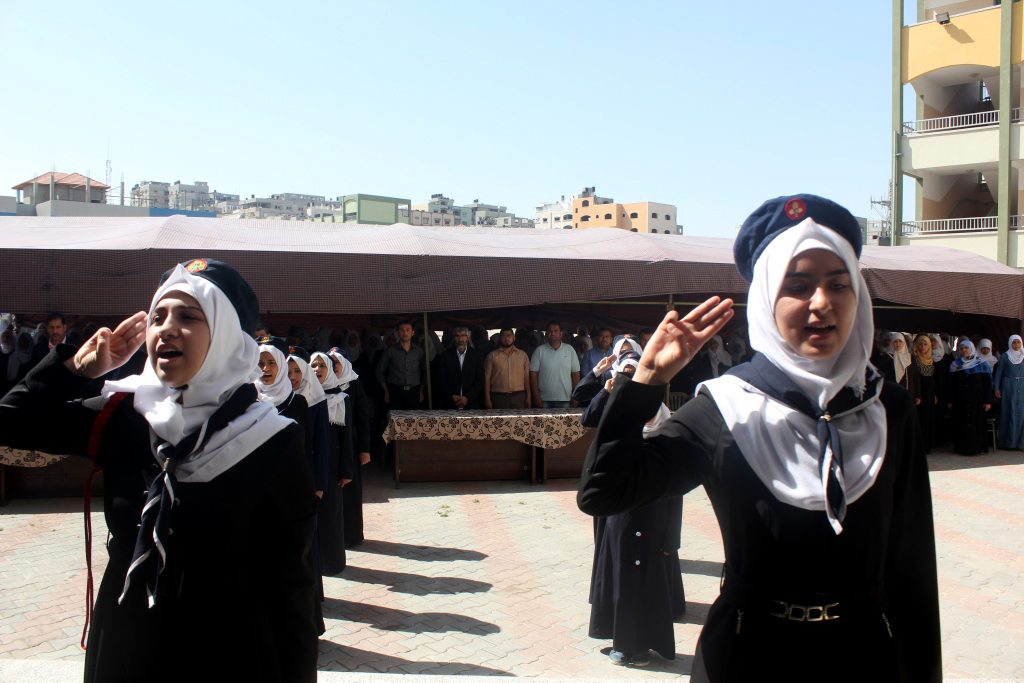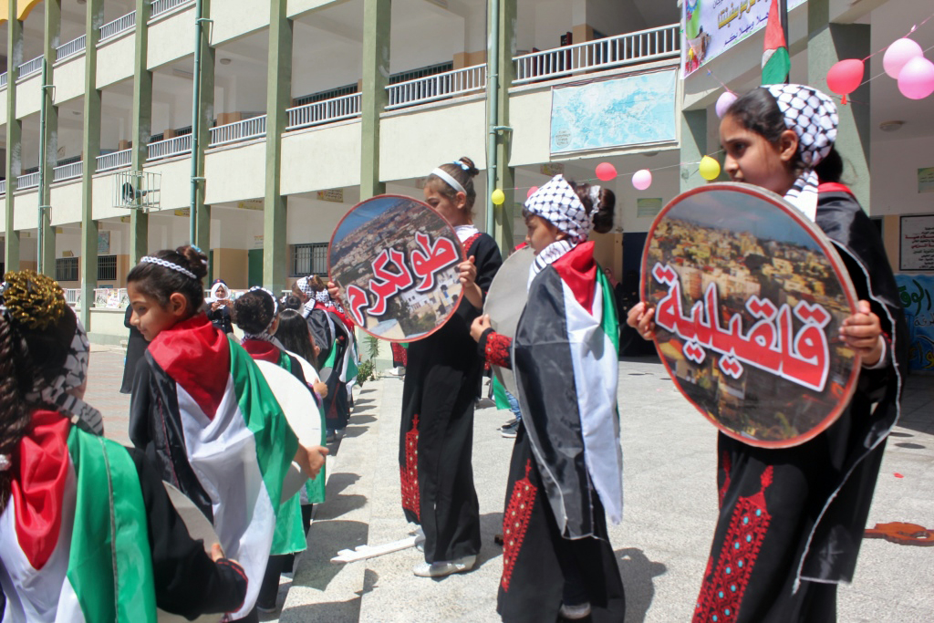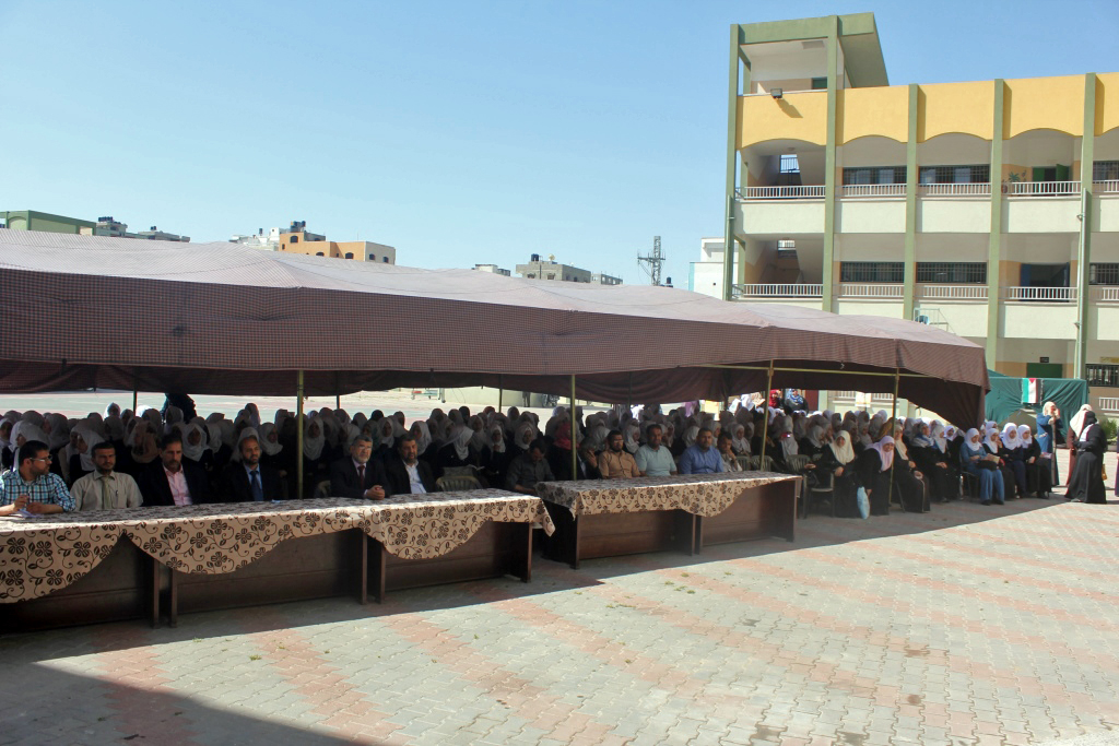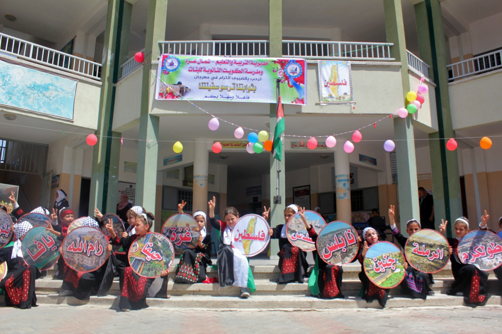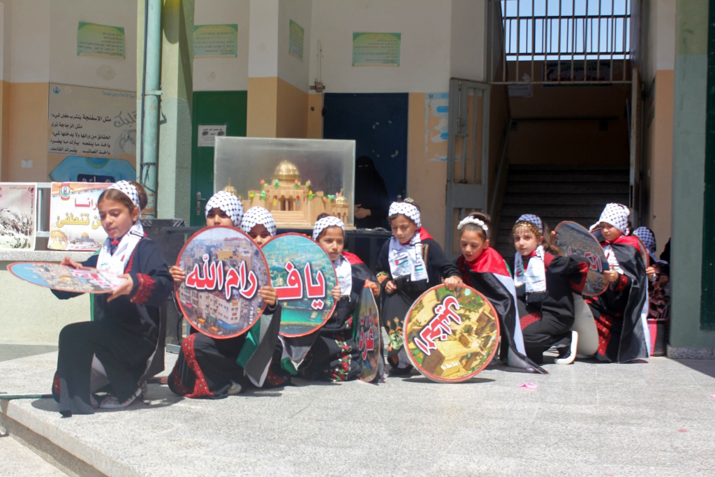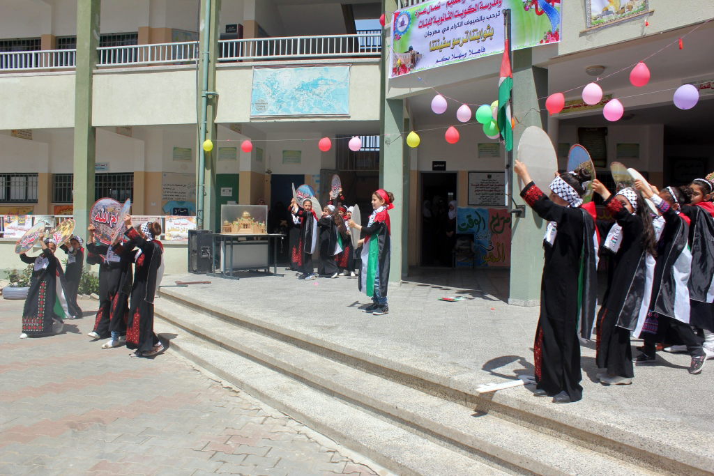 أسوار القدس العتيقة، قبة الأقصى المشرّفة, مفتاح العودة, يافا وحيفا والمجدل وأخواتهم من المدن والبلدات الفلسطينية المهجّرة، خيام اللاجئين، وزنازين الأسرى وفي القلب من ذلك فلسطين المسيّجة بدماء الشهداء، هذا أول ما تقع عليه عيناك في فعالية من الفعاليات التي تنظمها مدارس مديرية التربية والتعليم في شمال غزة، والتي كان آخرها احتفال مدرسة الكويت الثانوية للبنات، والذي جاء بعنوان "بثوابتنا ترسو سفينتنا" تزامنا مع إحياء ذكرى فعاليات يوم الأسير الفلسطيني.