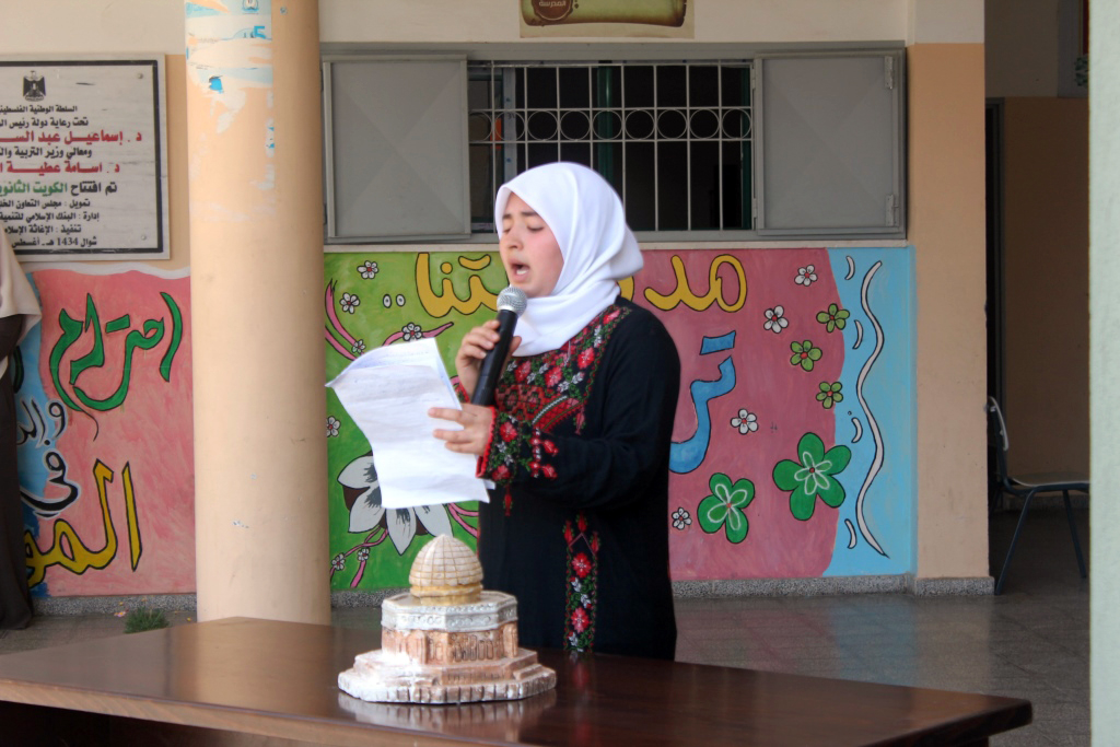 ومن أمام مجسّم لقبة الصخرة، صدح مدير الدائرة الفنية لمديرية التربية والتعليم منير أبو زعيتر ليغرس معاني حب الوطن في نفوس الطالبات، مؤكدًا أن الحفاظ على الثوابت جزء لا يتجزأ من الفلسفة التربوية التي تتبعها وزارة التربية والتعليم العالي في بناء الأجيال الفلسطينية المتلاحقة.
