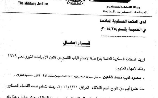أمهلت المحكمة العسكرية الدائمة التابعة لهيئة القضاء العسكري بغزة المتهم محمود أديب شاهين "مدني من مواليد 1988 ويحمل هوية رقم 801837451" لتسليم نفسه للقضاء العسكري بمدةٍ أقصاها عشرة أيام من تاريخ اليوم 26/4/2016 م.