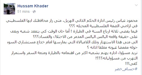وطالب خضر بأن يكون عباس "مسؤول إدارة يهتم بشعبه أكثر من اهتمامه بالطيارة ومتعة السفر واستمرار التهرب من مسؤولياته؟؟؟!".