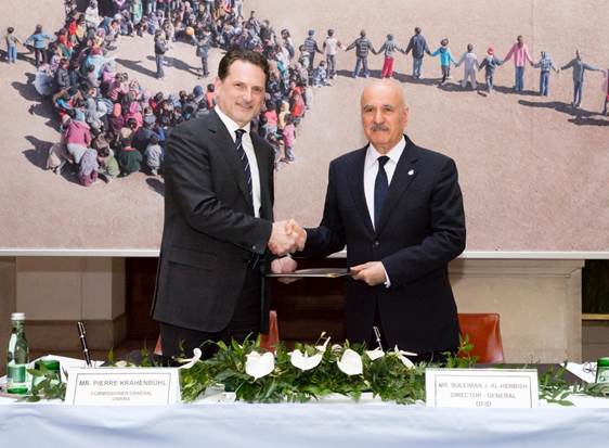 وقام بتوقيع الاتفاقية كل من المفوض العام للأونروا بيير كرينبول والمدير العام لصندوق الأوبك سليمان الهربش في وقت سابق من هذا اليوم وذلك خلال حفل افتتاح معرض "الطفل المرح" الذي استضافه الصندوق في مقره بفيينا بمناسبة الاحتفال بالذكرى السنوية الأربعين لتأسيس الصندوق.