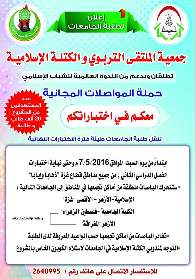 أنهت الكتلة الإسلامية وجمعية الملتقى التربوي وبدعم من الندوة العالمية للشباب استعدادهم لإطلاق حملة المواصلات المجانية " معكم في اختباراتكم " لنقل الطلاب والطالبات من وإلى الجامعات طيلة فترة الامتحانات.