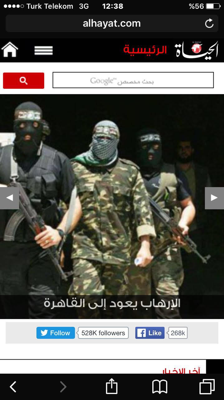 وقعت صحيفة الحياة اللندنية في سقطة كبيرة بعد نشرها صورة للناطق باسم كتائب القسام الجناح العسكري لحركة "حماس" أبو عبيدة برفقة آخرين على خبر بعنوان "الإرهاب يعود إلى القاهرة".