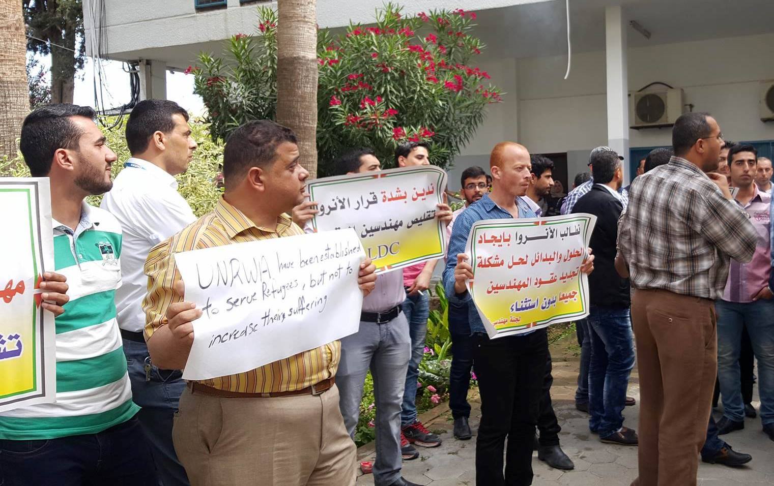 اعتصم العشرات من مهندسي العقود، في وكالة غوث وتشغيل اللاجئين الفلسطينيين "الأونروا"، لليوم الثالث على التوالي أمام وداخل مقر الوكالة بغزة احتجاجاً على قرار فصلهم وإنهاء عقودهم.