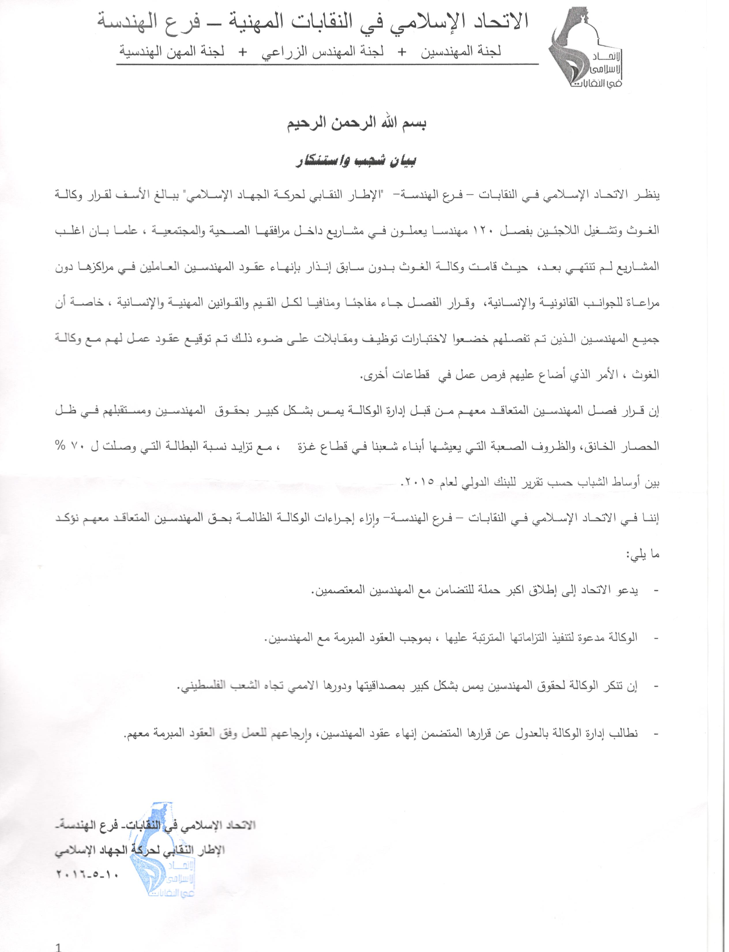 طالب الاتحاد الإسلامي في النقابات، الإطار النقابي لحركة الجهاد الإسلامي، اليوم الثلاثاء، وكالة الغوث وتشغيل اللاجئين "أونروا"، بالعدول عن قرارها المتضمن بفصل 120 مهندسًا يعملون في مقراتها الصحية والمجتمعية، وإرجاعهم للعمل ضمن العقود المبرمة.
