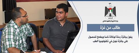 فالطالب شحادة حصل علي المركز الأول علي مستوى قطاع غزة والعاشر علي فلسطين في مسابقة مؤسسة النيزك للتعليم المساند والإبداع العلمي ضمن مشروع تطبيق بناء الروبوت.