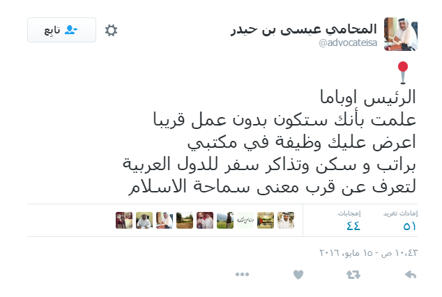 وغرد المحامي عبر حسابه على موقع التواصل الاجتماعي "تويتر": "الرئيس أوباما، علمت بأنك ستكون بدون عمل قريبا، أعرض عليك وظيفة في مكتبي".