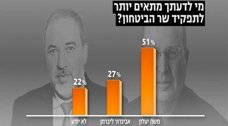 ووفق الاستطلاع الذي أجرته القناة العبرية فإن أكثر من نصف من الإسرائيليين يعتقدون أن يعالون أكثر ملاءمة للعمل في المنصب الحساس، مع 27٪ فقط قائلين أن ليبرمان أفضل لهذا المنصب.