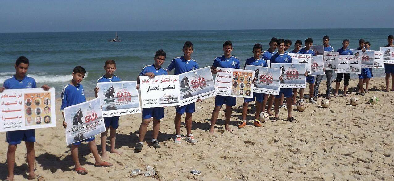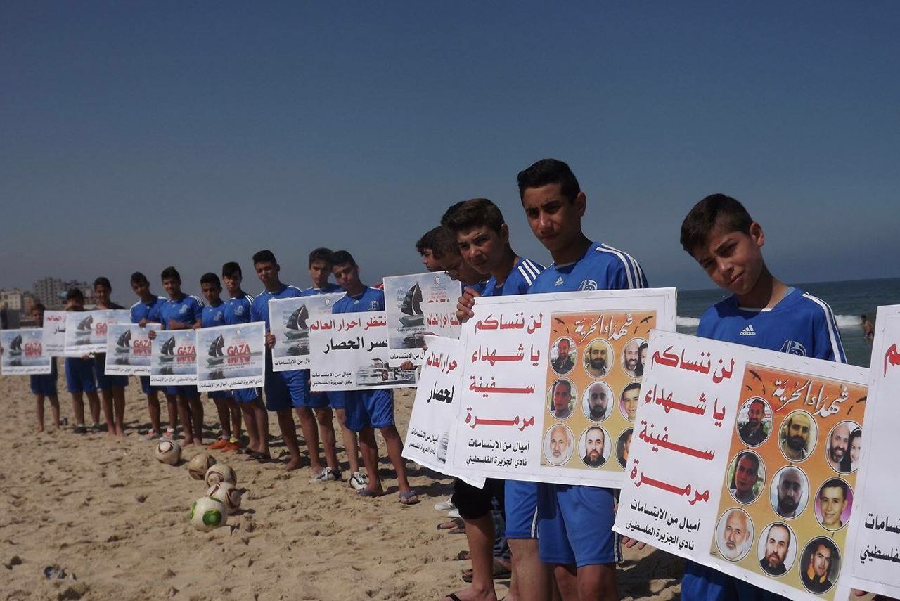شارك عشرات الشبان في سلسلة بشرية على شاطئ بحر غزة تخليداً لذكري لشهداء سفينة "مافي مرمرة" في الذكرى السادسة للهجوم الإسرائيلي على أسطول الحرية.