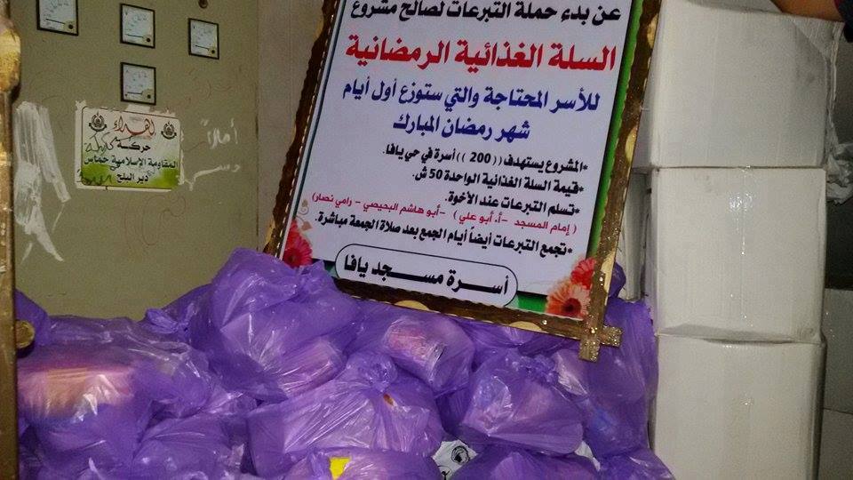 نفذت أسرة مسجد يافا وبالتعاون مع لجنة زكاة دير البلح مشروع "السلة الغذائية الرمضانية" والذي أعلنت عنه قبل رمضان بشهرين في حملة ضخمة لجمع التبرعات من عمار المسجد راصدة أن توزع (200) طرد غذائي للأسر المستورة في حي يافا الإسلامي.