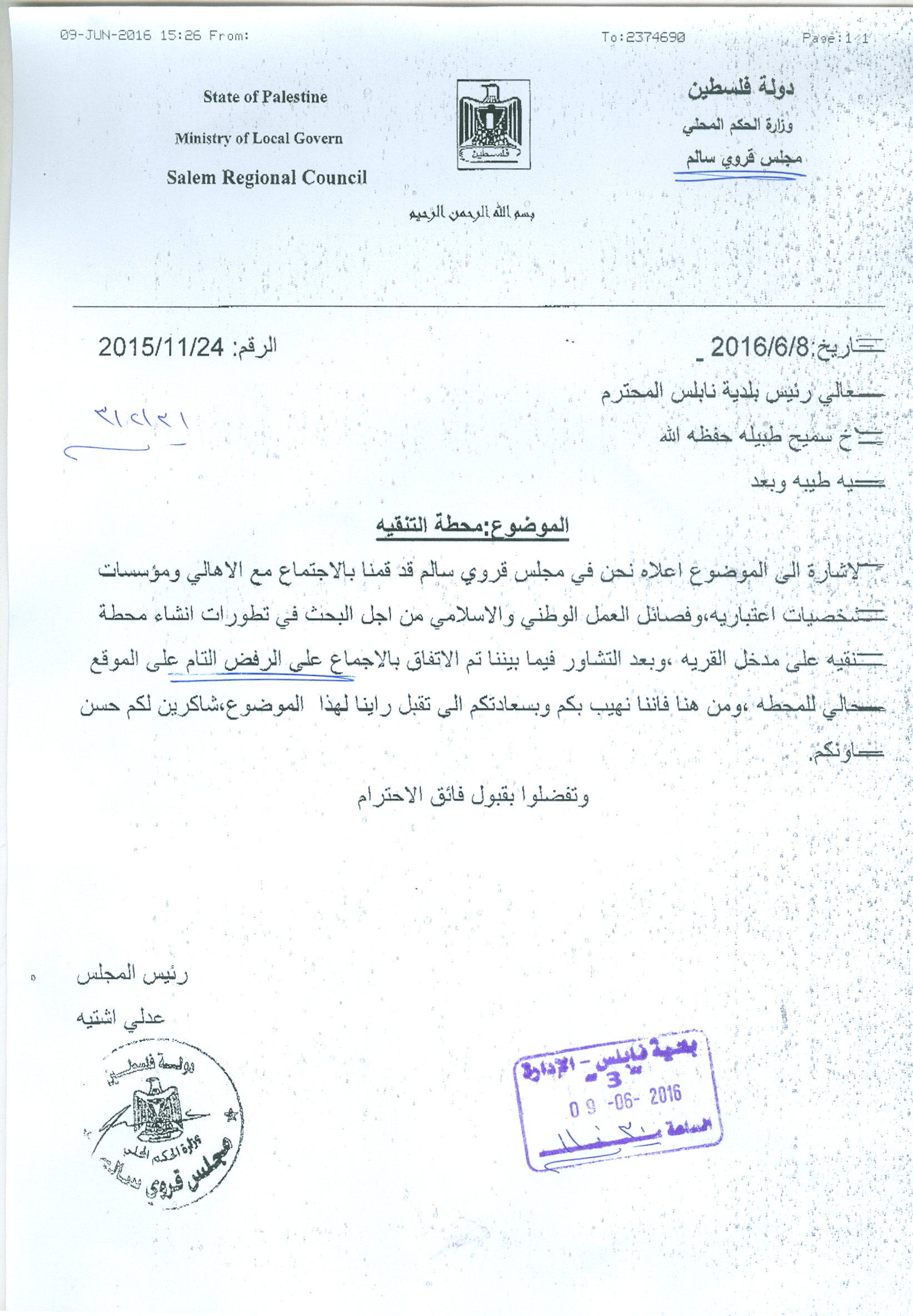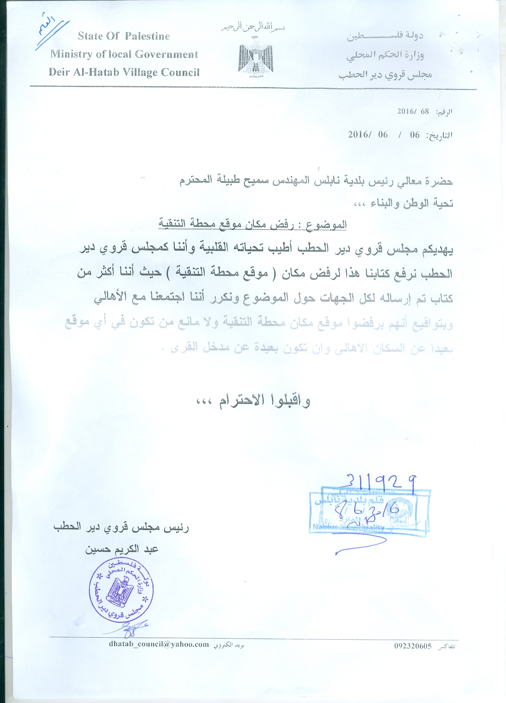 كما أوضح طبيلة أن بلدية نابلس قد فوجئت مؤخراً برفض القرى الشرقية لهذا المشروع من خلال المناشدة الرسمية في صحيفة القدس والموجهة للجهات الرسمية بعدم إقامة هذا المشروع بحجة قربه من المنازل، علما أن المجالس قد طلبت إزاحة موقع المحطة لمئتي متر، وإقامة حدائق في محيط المنطقة، ووافقت البلدية على ذلك، إلا أنها رفضت مؤخرا بشكل قاطع إقامة المشروع.