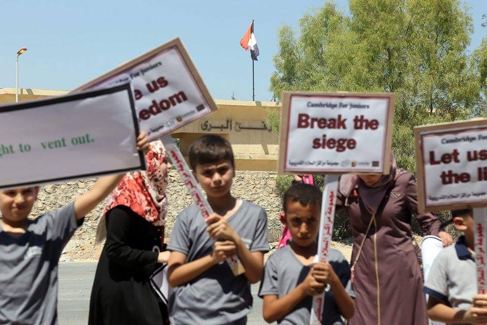 ورفع الأطفال لافتات كُتب عليها رسائل موجهة للعالم بلغتين "العربية، والانجليزية" تطالب العالم بسرعة فك الحصار الظالم المفروض على قطاع غزة منذ أكثر من 0 سنوات وفتح المعابر، لإدخال المواد الغذائية والعلاج ومواد البناء اللازمة لقطاع غزة.