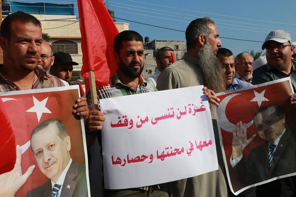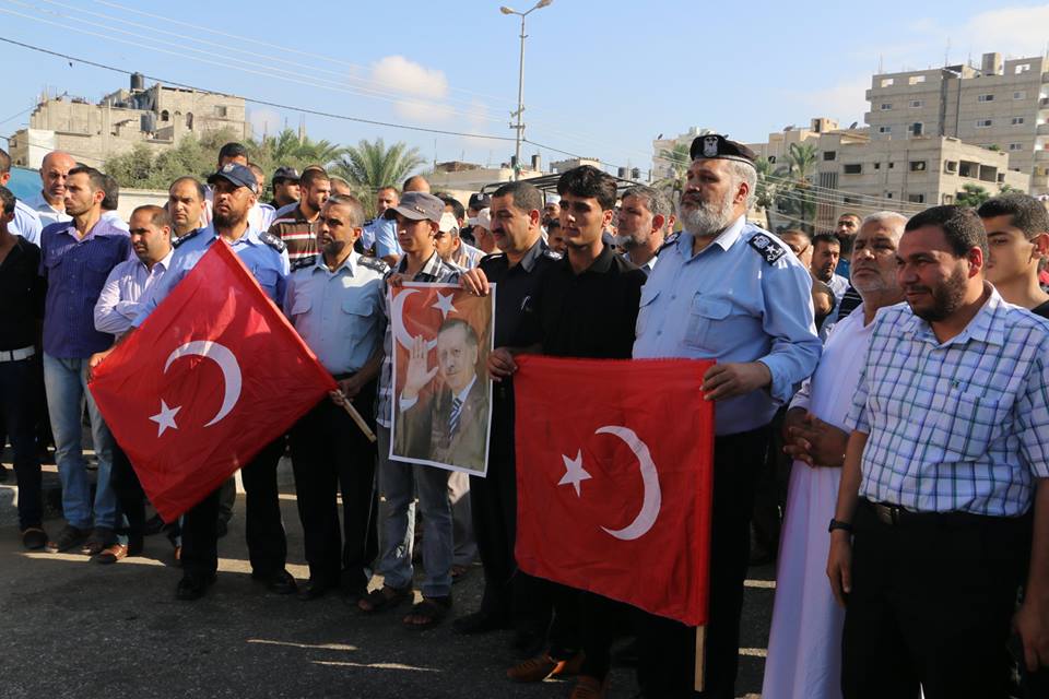 ورفع المتظاهرون خلال خروجهم العلمين الفلسطيني والتركي للتعبير عن محبتهم للشعب والحكومة التركية وعبارات تؤكد عمق العلاقة بين الشعبين.