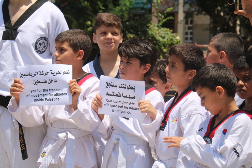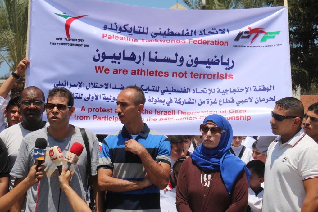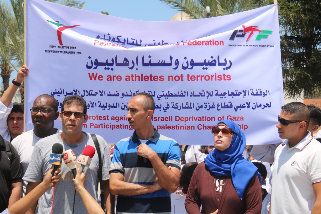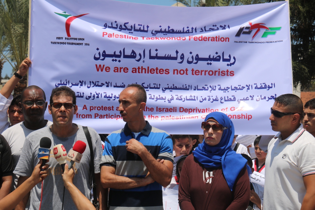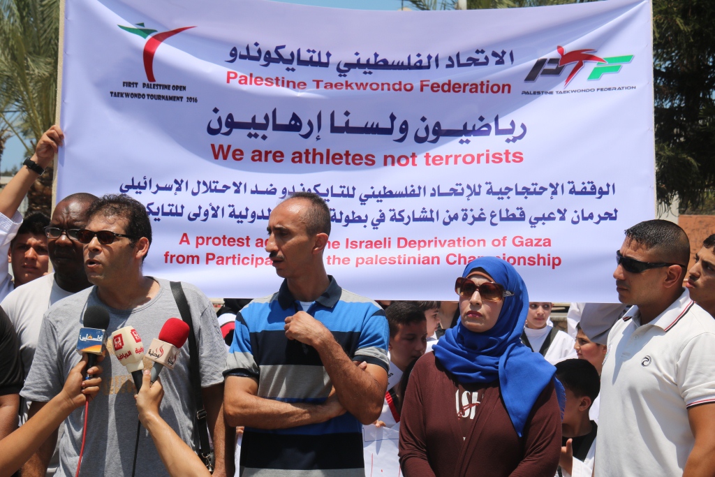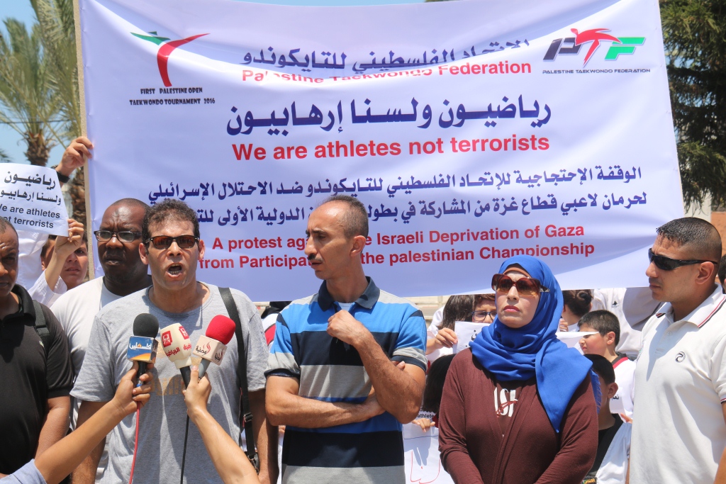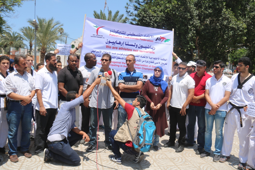 وقال عضو الاتحاد الفلسطيني للتايكوندو، ايهاب سليم، خلال وقفة نظمها الاتحاد في ساحة الجندي المجهول وسط مدينة غزة: "إن هذه الوقفة تأتي ردًا على استمرار سلطات الاحتلال في تعنتها ورفضها لمشاركة الرياضيين في محافظات غزة في البطولات والدورات الرياضية الخارجية".
