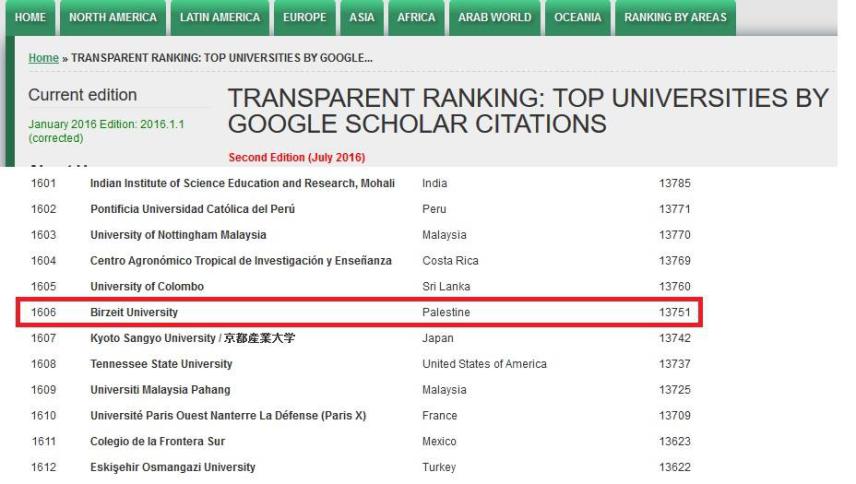 واستند هذا التصنيف لمعطيات منصة الباحث العلمي (Google Scholar) والتي تتضمن عدد الاقتباسات التي حصلت عليها الأبحاث العلمية المنشورة للباحثين ولأساتذة الجامعات. وتم ترتيب الجامعات بناءً على مجموع الاقتباسات للعشرة أساتذة الأوائل في كل جامعة، مع استثناء الأول من كل قائمة من أجل الحصول على تمثيل أفضل لمستوى الجامعة. وتبعاً لذلك فقد بلغ مجموع الاقتباسات لأساتذة جامعة بيرزيت المشمولين ضمن الإحصائية 13751 إشارة اقتباس، فيما بلغ عدد الاقتباسات للجامعة الفلسطينية التالية 10072، محتلة بذلك المرتبة 34 عربياً و1840 عالميًا.