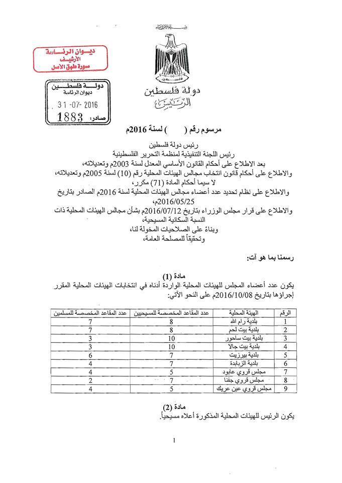 وحسب المرسوم، جرى تحديد عدد المقاعد المخصصة للمسيحيين والمسلمين لبعض المدن في الضفة الغربية بعد الاطلاع على أحكام القانون الأساسي المعدل لسنة 2003 وتعديلاته وأحكام قانون انتخاب مجالس الهيئات المحلية رقم 10 لسنة 2005 الصادر بتاريخ 25/5/2016.