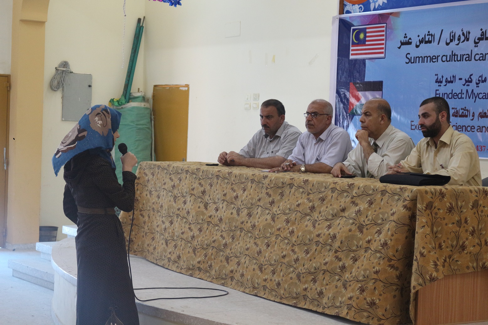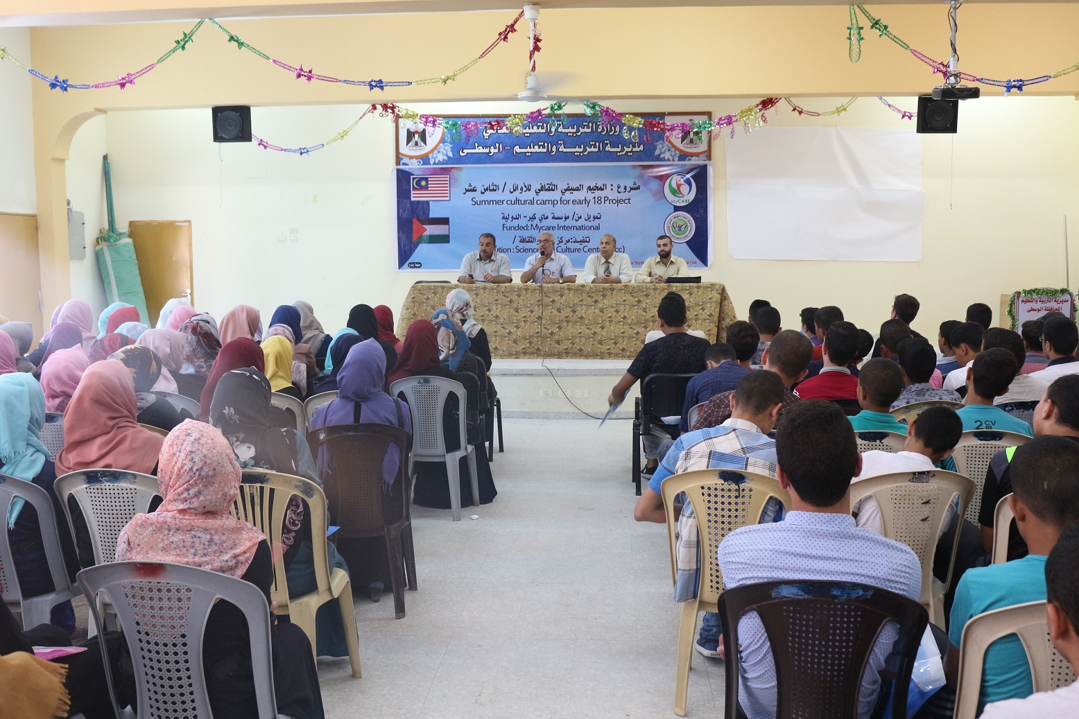 ضمن فعاليات المخيم الصيفي الثقافي لأوائل الطلبة وعلى مسرح مديرية التربية والتعليم بالمحافظة الوسطى التقى الطلبة الأوائل بمدير التربية التعليم الأستاذ علي أبو حسب الله، وذلك بحضور رئيس مركز العلم والثقافة أ.د. كمال غنيم، والأستاذ محمد حمدان رئيس قسم الإشراف.
