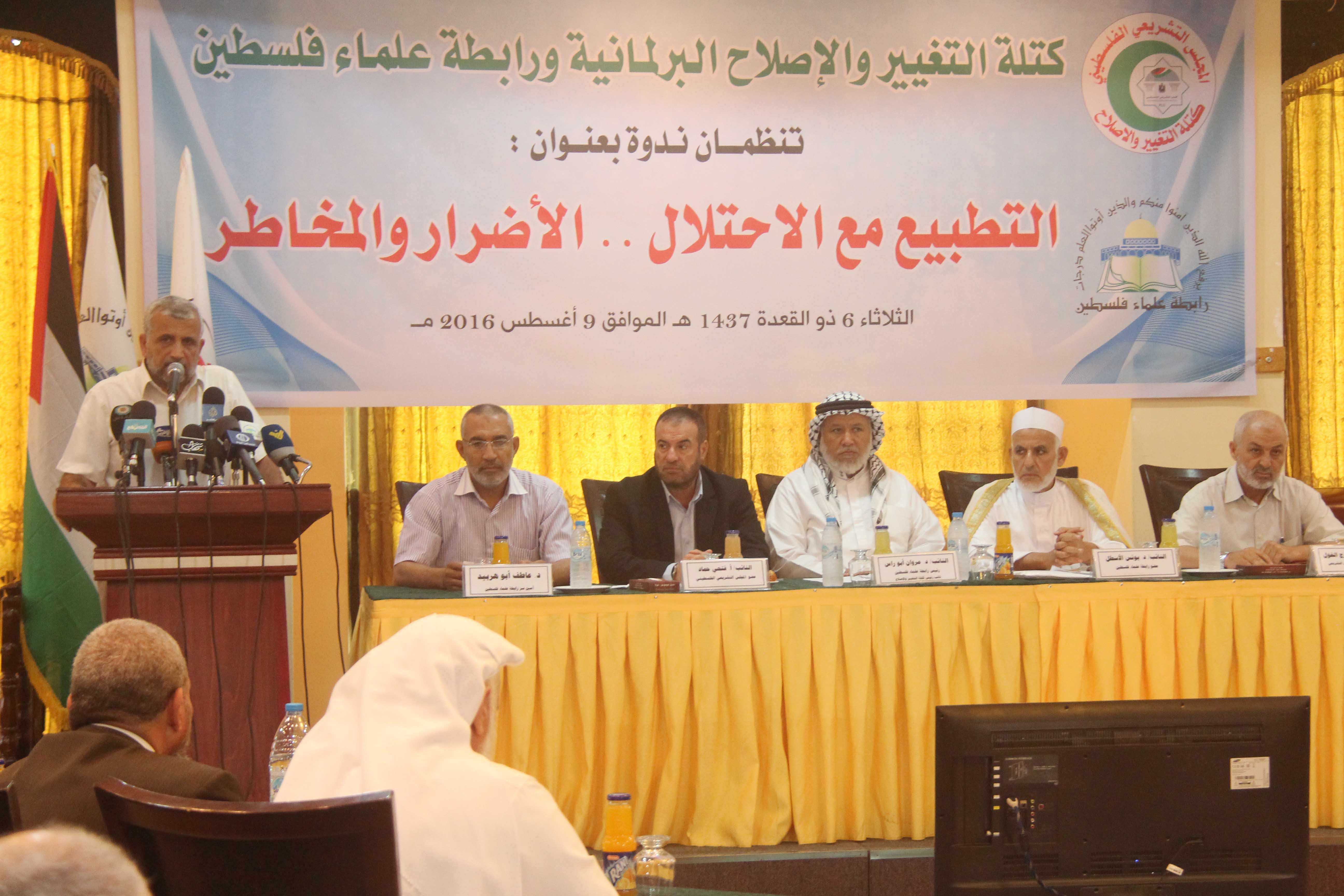 نظمت رابطة علماء فلسطين وكتلة التغيير والإصلاح البرلمانية ندوة إعلامية بعنوان: (التطبيع مع الاحتلال.. الأضرار والمخاطر)، وسط حضور عدد من قادة الفصائل الفلسطينية، وعدد من نواب المجلس التشريعي والعلماء والمثقفين، وذلك في قاعة فندق الكمودور بمدينة غزة.