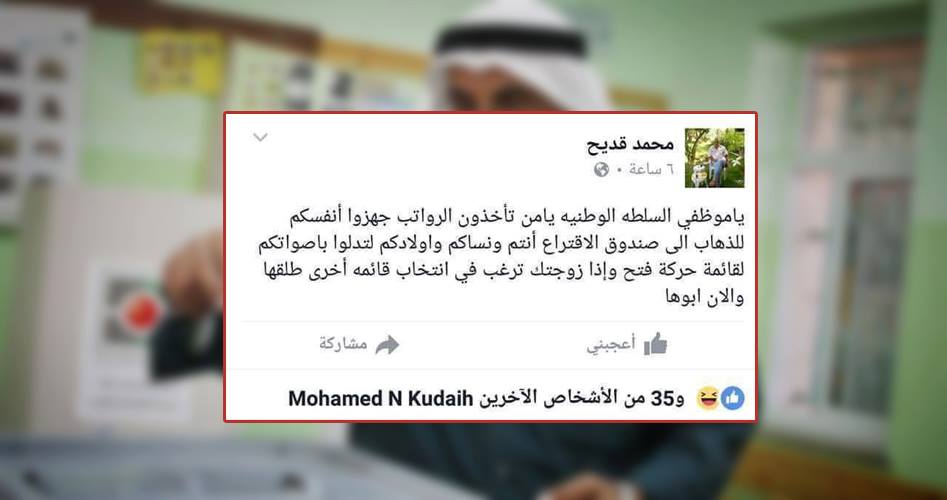 وقال قديح عبر صفحته "فيسبوك"، "يا موظفي السلطة، يا من تأخذون الرواتب، جهزوا أنفسكم للذهاب إلى صندوق الاقتراع أنتم ونساؤكم وأولادكم لتدلوا بأصواتكم لقائمة فتح، وإذا زوجتك رغبن في انتخاب قائمة أخرى طلقها والآن (العن) أبوها".