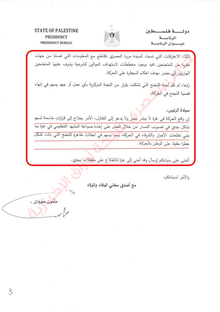 وتشير الوثائق الموجهة من مأمون سويدان القيادي الفتحاوي السابق في قطاع غزة إلى رئيس السلطة محمود عباس إلى معلومات مؤكدة عن تورط توفيق الطيراوي بالتحالف مع المتجنحين في الحركة وتسهيل سفرهم.