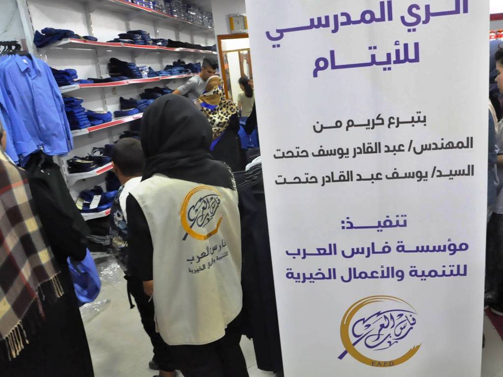 نفذت مؤسسة فارس العرب للتنمية مشروع "الزي المدرسي للأطفال الأيتام" بتمويل كريم من فاعلين الخير المهندس عبد القادر يوسف حتحت والسيد يوسف عبد القادر حتحت وذلك ضمن الأنشطة الخيرية التي تنفذها المؤسسة خلال العام.