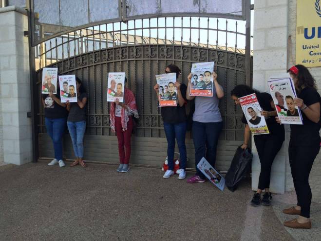 وقامت مجموعة من الشبان والشابات بالاعتصام أمام مقر الأمم المتحدة في ضاحية الماصيون في رام الله، ورفعوا صور الأسرى المضربين عن الطعام، ورفعوا اللافتات التي تدين صمت الأمم المتحدة والمنظمات الدولية إزاء جرائم الاحتلال بحق الشعب الفلسطيني بأسره والأسرى على وجه التحديد.