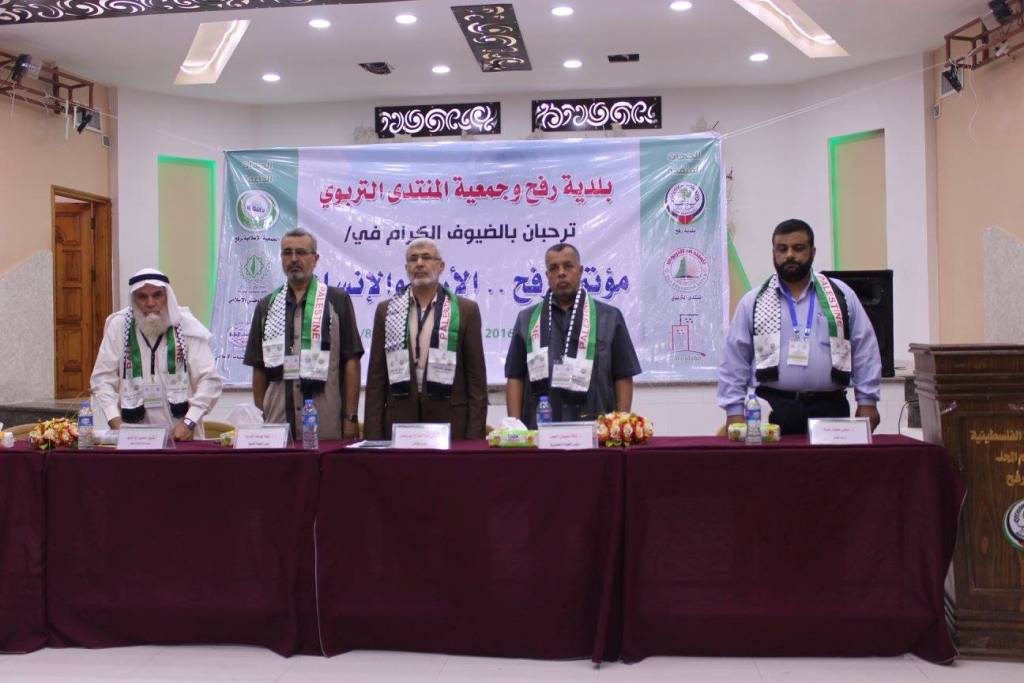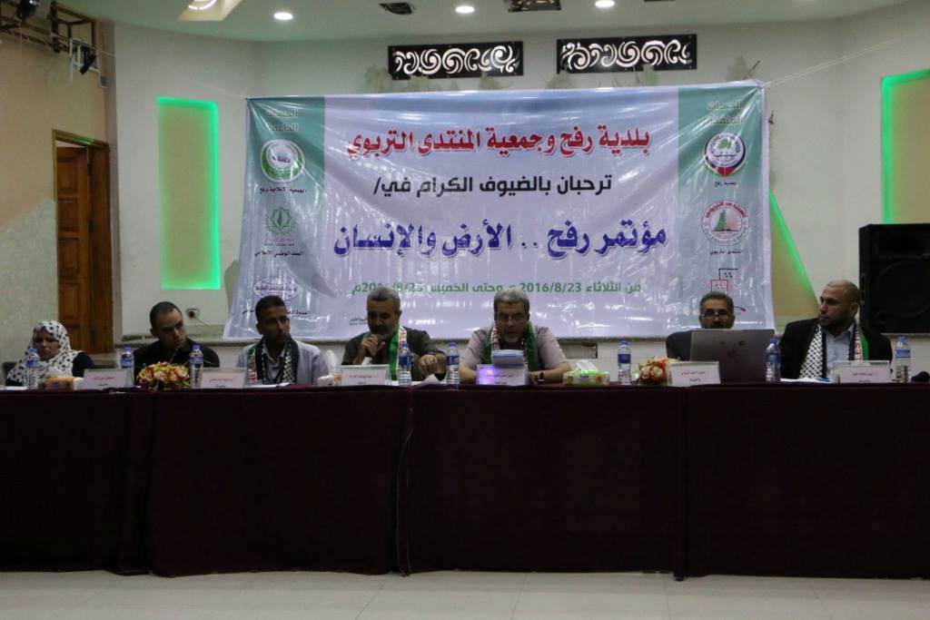 وأشاد أبو رضوان ببلدية رفح وبدور المنتدى التربوي في عقد المؤتمر قائلًا: "حرصت بلدية رفح على تنظيم هذا المؤتمر بتعاون وبتنسيق تام مع المنتدى التربوي لأجل مدينة رفح الأرض والإنسان".