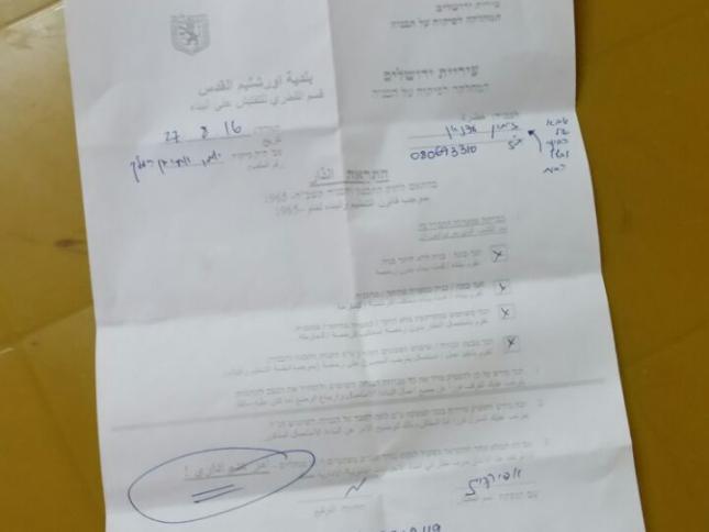 وذكر أن مواطناً من عائلة مراغة تسلم إنذارا يقضي بهدم جزء من سور منزله الذي يبلغ إرتفاعه أربعة أمتار، حيث يقضي الانذار الاسرائيلي بهدم اجزاء من هذا السور مع الابقاء علية بارتفاع متر واحد فقط.