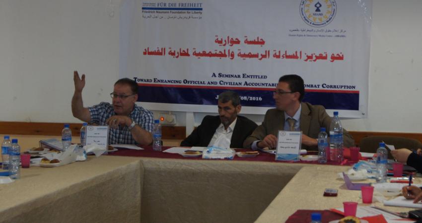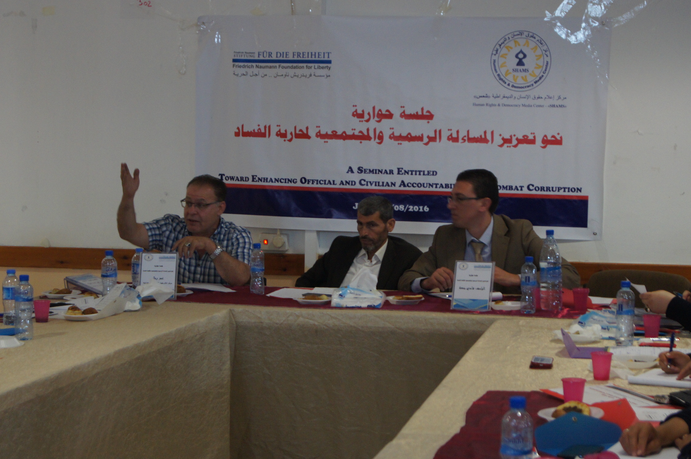 عقد مركز إعلام حقوق الإنسان والديمقراطية "شمس"، بالتعاون مع مؤسسة "فريدريش ناومن" من أجل الحرية- جلسة حوارية بعنوان "نحو تعزيز المساءلة الرسمية والمجتمعية لمحاربة الفساد" في بلدية جنين، كجزء من مشروع ينفذه المركز على مستوى محافظات الضفة يتعلق بمنطلقات الحكم الرشيد في قطاع الحكم المحلي والخدمات التي تقدمها الهيئات المحلية.