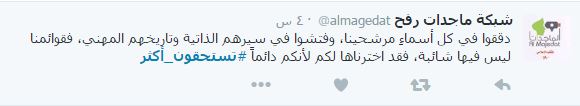 وكتب حساب باسم "شبكة ماجدات رفح" تغريدة قال فيها "دققوا في كل أسماءِ مرشحينا، وفتشوا في سيرهم الذاتية وتاريخهم المهني، فقوائمنا ليس فيها شائبة، فقد اخترناها لكم لأنكم دائماً #تستحقون_أكثر"، في إشارة إلى إسقاط لجنة الانتخابات المركزية لعدد من قوائم حركة فتح لثبوت سوابق قانونية وأخلاقية بحق مرشحين فيها.