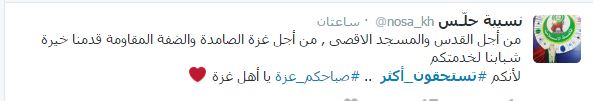 وقالت الناشطة نسيبة حلّس في تغريدة "من أجل القدس والمسجد الأقصى, من أجل غزة الصامدة والضفة المقاومة قدمنا خيرة شبابنا لخدمتكم لأنكم #تستحقون_أكثر .. #صباحكم_عزة يا أهل غزة".