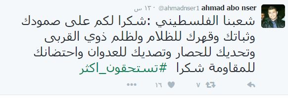 وتوجّه الناشط الصحفي أحمد أبو نصر بالشكر لشعب فلسطين الذي احتضن المقاومة وصمد في وجه الظلم، فكتب يقول "شعبنا الفلسطيني :شكرا لكم على صمودك وثباتك وقهرك للظلام ولظلم ذوي القربى وتحديك للحصار وتصديك للعدوان واحتضانك للمقاومة شكرا #تستحقون_اكثر".