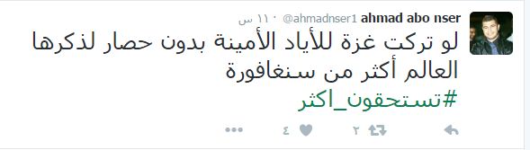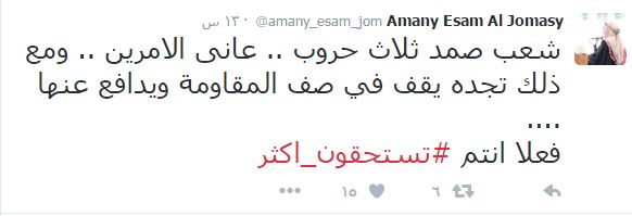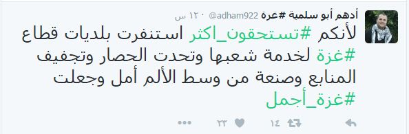 وكتبت الناشطة أماني الجماصي تشكر شعب غزة قائلة " شعب صمد ثلاث حروب .. عانى الامرين .. ومع ذلك تجده يقف في صف المقاومة ويدافع عنها .... فعلا انتم #تستحقون_اكثر".
