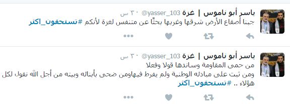 وكتب الناشط يا أبو ناموس يخاطب جماهير غزة "شعبنا شعب الوفاء .. كنا ولا زلنا نعمل من أجل حياة أفضل لكم ولأبنائكم لأنكم #تستحقون_اكثر".